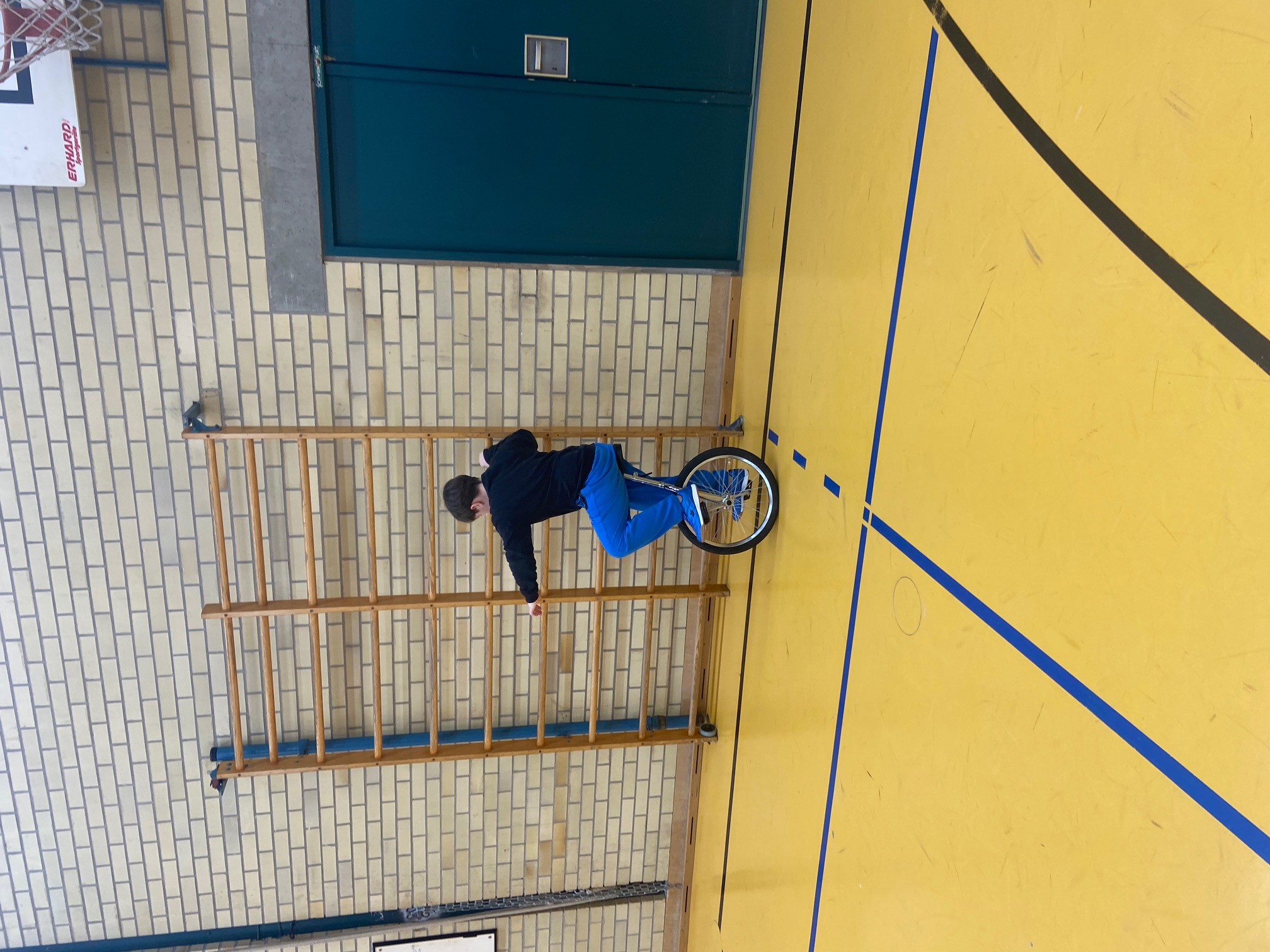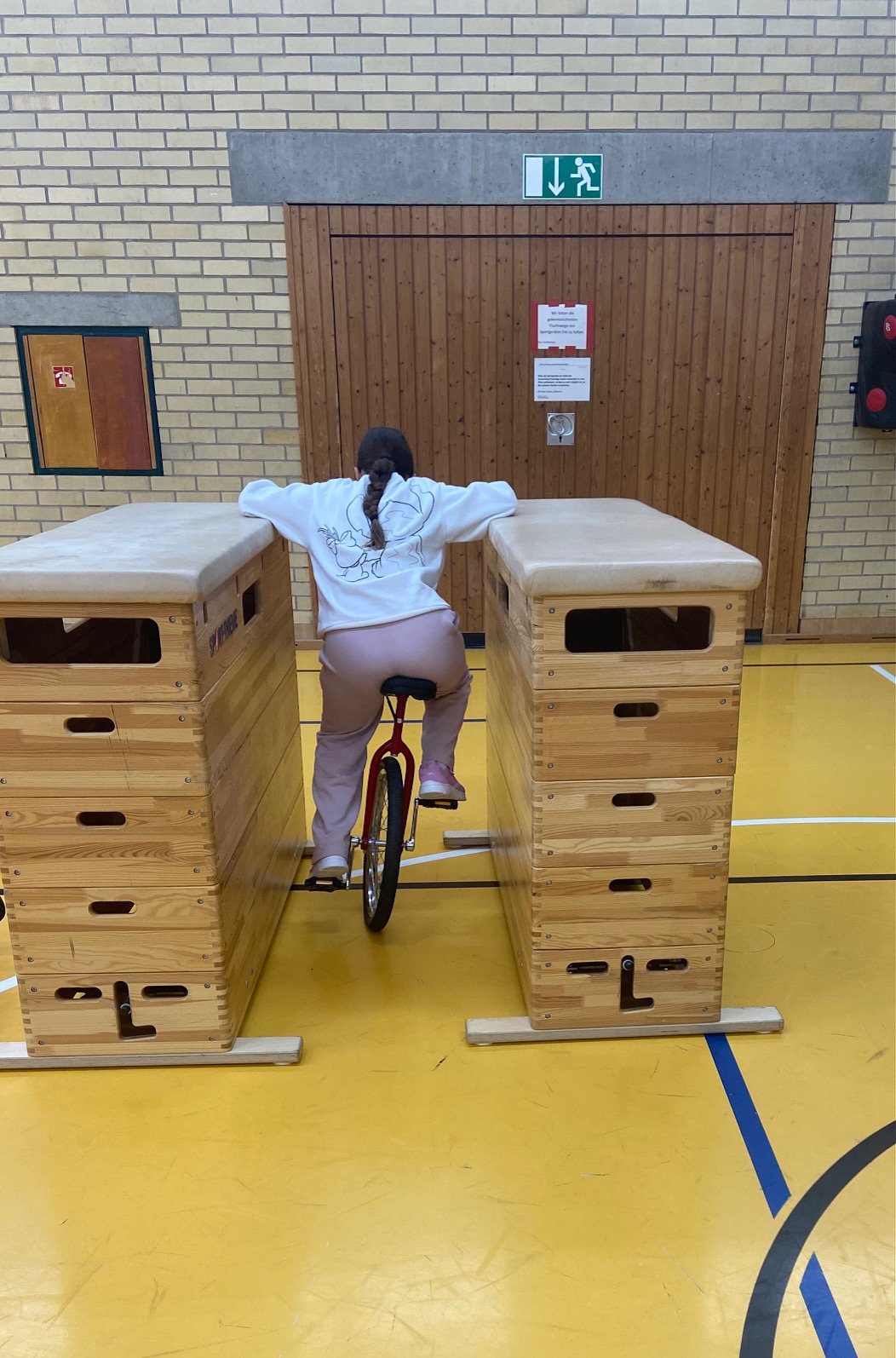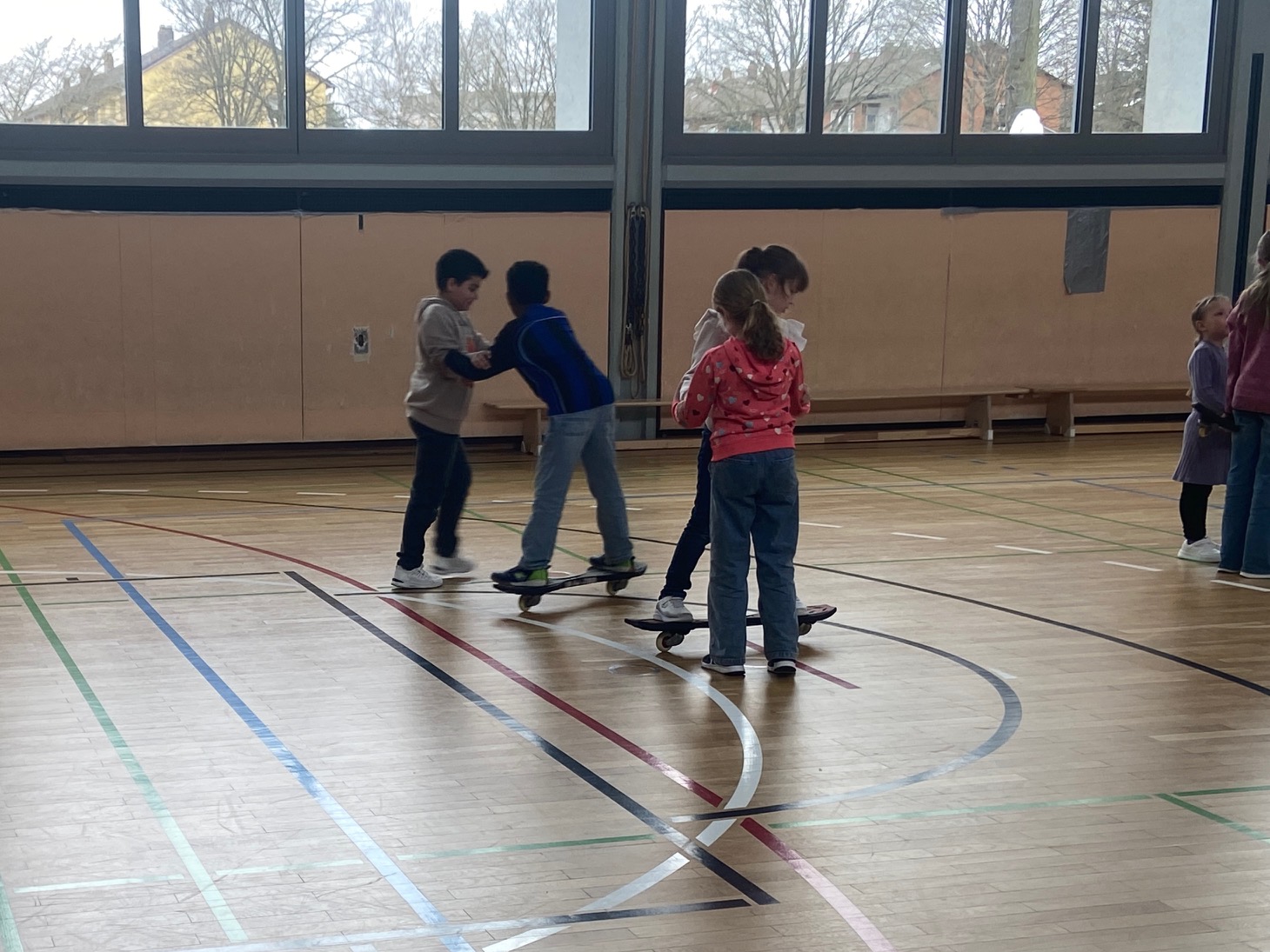 Jeweils eine Gruppe fuhr Waveboard, die andere Hälfte der Klasse probierte das Einradfahren aus. Anschließend wurde getauscht.