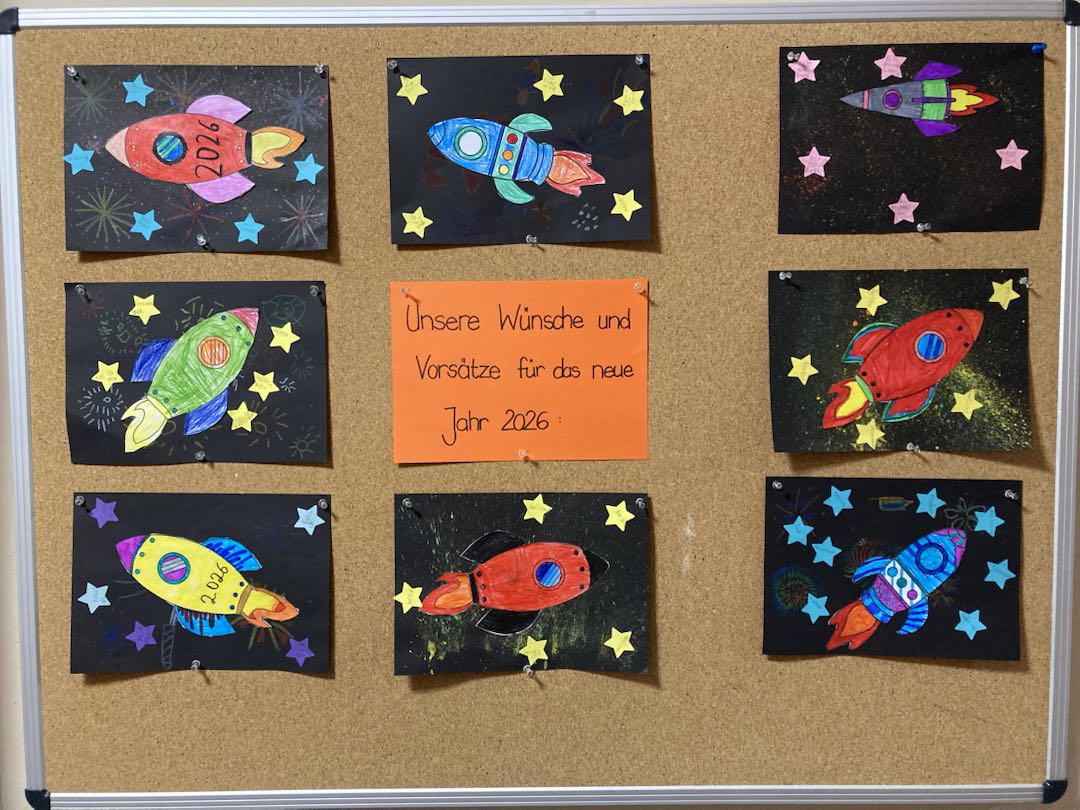 Passend zum Start des neuen Jahres gestalteten die Kinder der 2a im Kunstunterricht tolle Kunstwerke zu ihren Wünschen und Vorsätzen für das Jahr 2026.