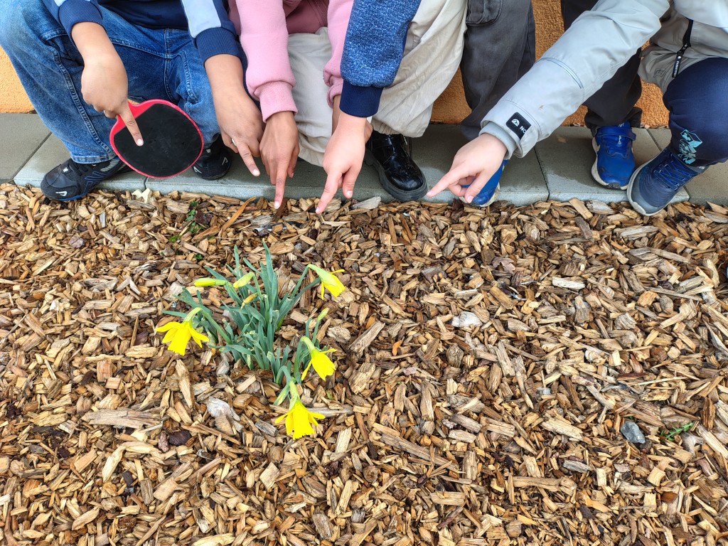 Mit großer Freude entdeckten die Kinder unsere ersten blühenden Osterglocken auf dem Pausenhof.