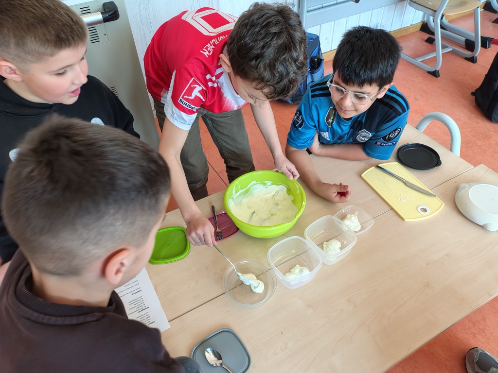 Auch die Zubereitung durfte nicht fehlen: Obstspieße, Milchshake und Bananenquark wurden selbstständig zubereitet. Dabei mussten die Kinder auch (passend zum aktuellen Mathe-Thema) die Zutaten abwiegen. Im Anschluss wurde natürlich alles aufgegessen.